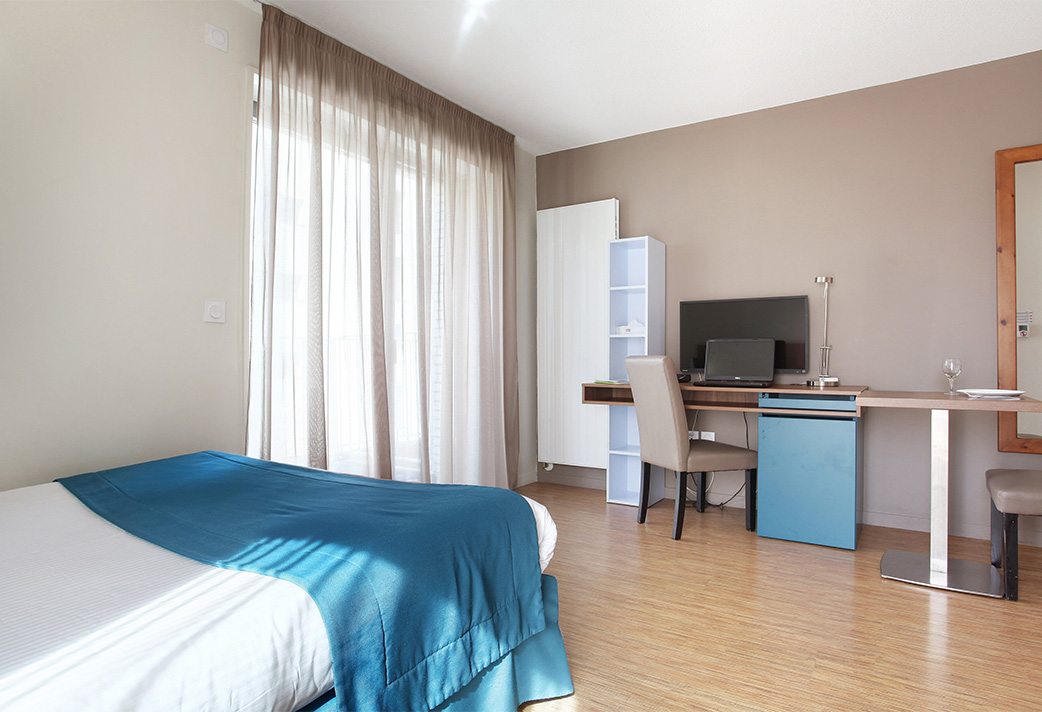 Prêt à vivre, les chambres meublées de la résidence sont spacieuses, bien équipées et fonctionnelles : kitchenette, coin nuit, salle de bain, espace jour.